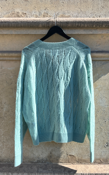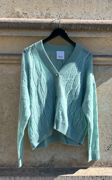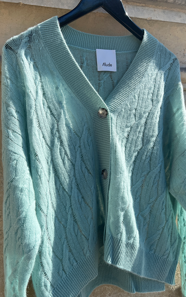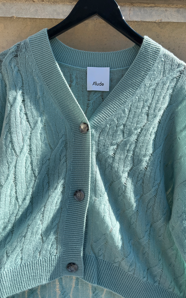 Grøn cashmere cardigan fra Allude i smuk kabelstrik og med store knapper. Cardiganen har v-hals og er lavet i en løs pasform.