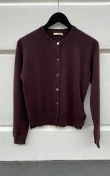 Klassisk cardigan i blød merinould. Modellen har rund hals, lange ærmer og gennemgående knaplukning foran. Den dybe bordeauxfarve giver et elegant og tidløst udtryk, der gør cardiganen nem at style til både hverdag og mere formelle anledninger.