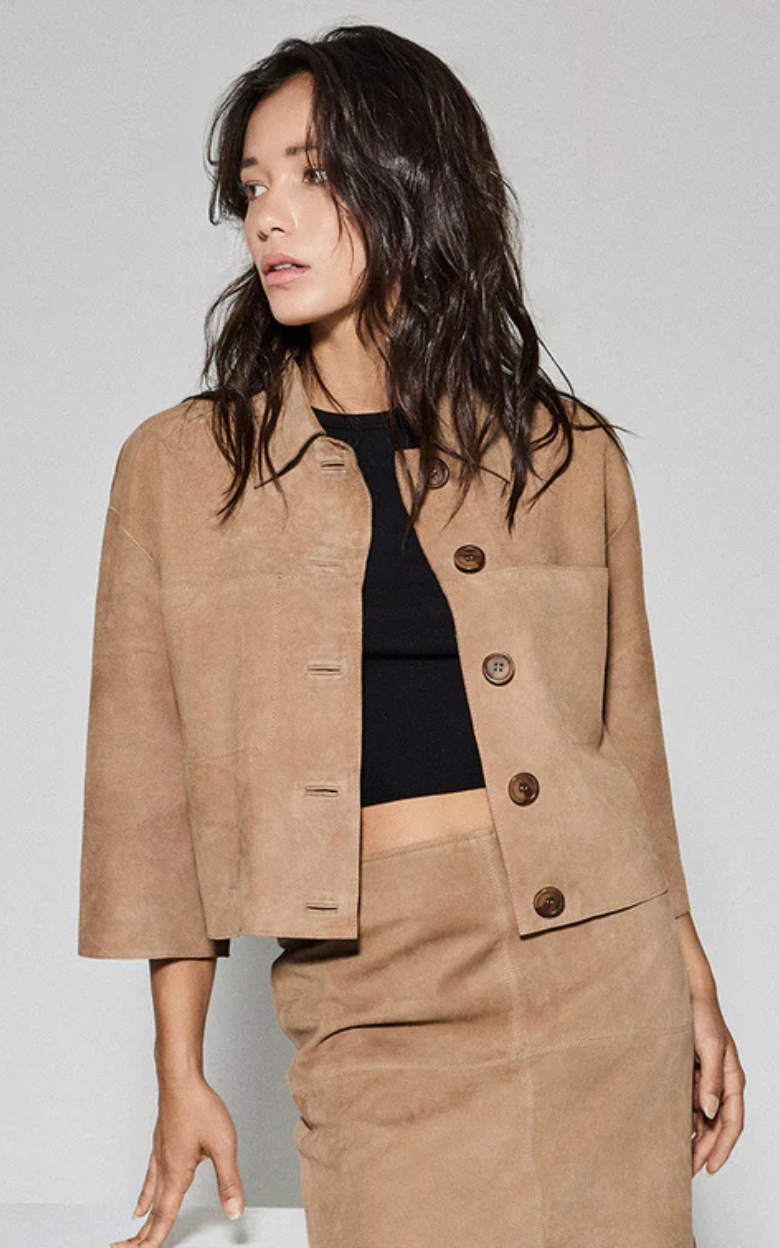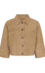 Frisk og feminin ruskindsjakke fra Notyz, fremstillet i det blødeste gederuskind. Jakken har et enkelt, klassisk og tidløst snit med lille krave, knaplukning foran og halvlange ærmer, som giver et let og elegant udtryk. Den korte længde gør jakken ideel over kjoler samt til højtaljede bukser, hvor den tilfører et eksklusivt og afslappet look. En luksuriøs ruskindsjakke, der nemt løfter både hverdags- og festgarderoben.