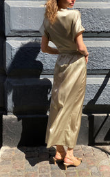 Elegant silke slå om kjole i en fin lys grøn/gylden farve. Kjolen v-udskæring og brede ærmer. Perfekt til sommmerens fester.