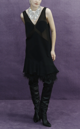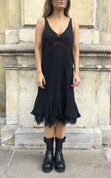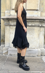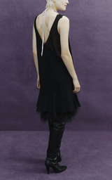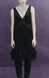 Smuk sort kjole med fjer. Kjolen har V-udskæring på front og ryg, gennemsigtige detaljer, vid nederdel i georgette med fjer, figursyet pasform og er knælængde.