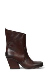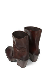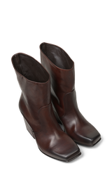 Støvler fra Ernesto Dolani i en smukt valnødbrunt skind. De har en firkantet snude og hæl - og et asymmetisk skaft der giver støvlen et cool look.