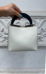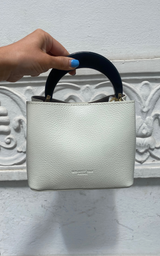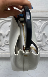 Smuk lille taske i ivory, med guld hardwear og et cool bredt håndtag i hård sort plast. Tasken er lavet i skind og er let lakeret, hvilket gør det lettere at rengøre overfladen. Tasken er delt i tre rum, hvor det midterste rum lukkes med lynlås. Der medfølger en længere crossbody rem i samme materiale som tasken.