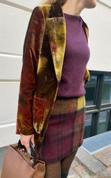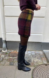 Kort nederdel i børstet uldblanding fra italienske Roberto Collina, med et eksklusivt ternet mønster i varme efterårsfarver. Den bløde mohairstruktur giver et luksuriøst, fluffy udtryk og gør nederdelen både elegant og komfortabel at have på.