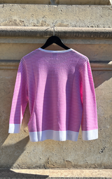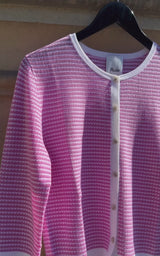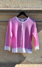 Smuk cardigan fra Allude den er lavet med pink striber i det fineste mønster og med hvide kanter.
