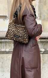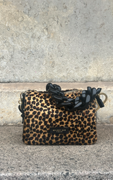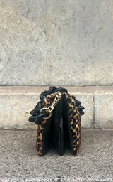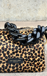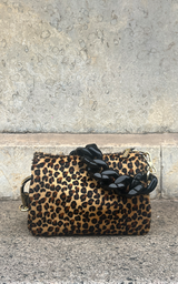 Super cool mindre taske lavet i i sort skind med ponyhår med leopardprint. Tasken har en chunky kæde-rem i sort plastik, guld hardwear og er inddelt i trerum. Der medfølger en cross-body rem i sort skind.