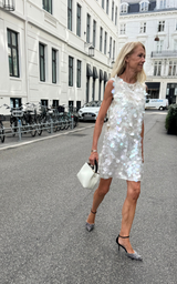Smukkeste festlige kjole fra Italienske Cirkus Hotel. Kjolen er bånd i taljen, hvilket skaber et to-delt udtryk, den er besat af hvide store runde palietter og har åbne sider der lukkes med et lille bånd.