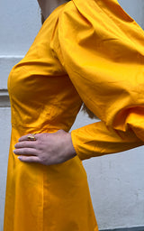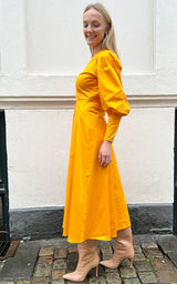 En smuk silhuet der er skåret til at komplementere alle former. En volumiøs nederdel der falder til læggen. Kjolen har V-hals og en søm i taljen. De lange ballon ærmer afsluttes med en diskret lynlås i manchetten.