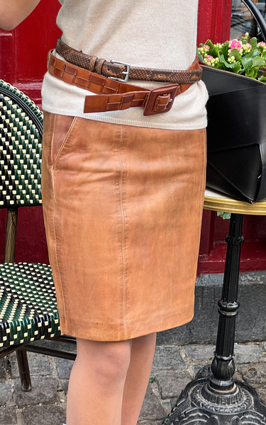 Smuk pencil-nederdel i flot vakset caramel farvet skind. Perfekt til at skabe et klassisk, men rårt look.