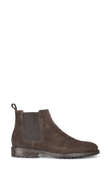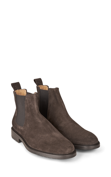 Flotte klassiske chelseastøvler i mørkebrun ruskind og med elastik på begge sider. Støvlerne har skridfaste gummisåler.