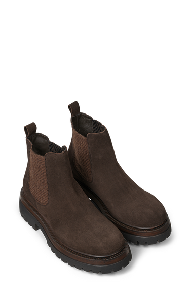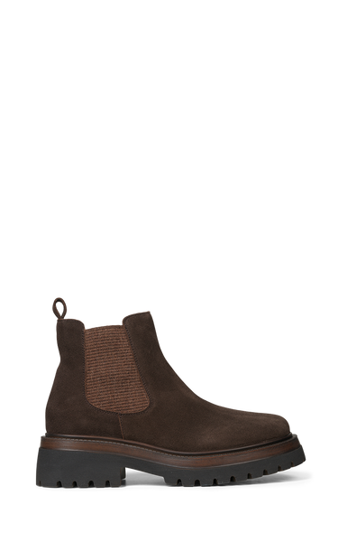 Super skønne støvler lavet i brun ruskind med elastik på begge sider hvori der er uld for at holde bedre på varmen. Støvlern har en chunky sål med en 5 cm hæl og overordnet en 3 cm sål. De har et kortere skaft, hvilket giver disse vinterstøvler et lettere look.