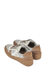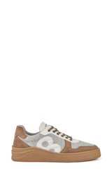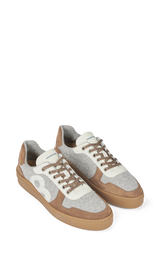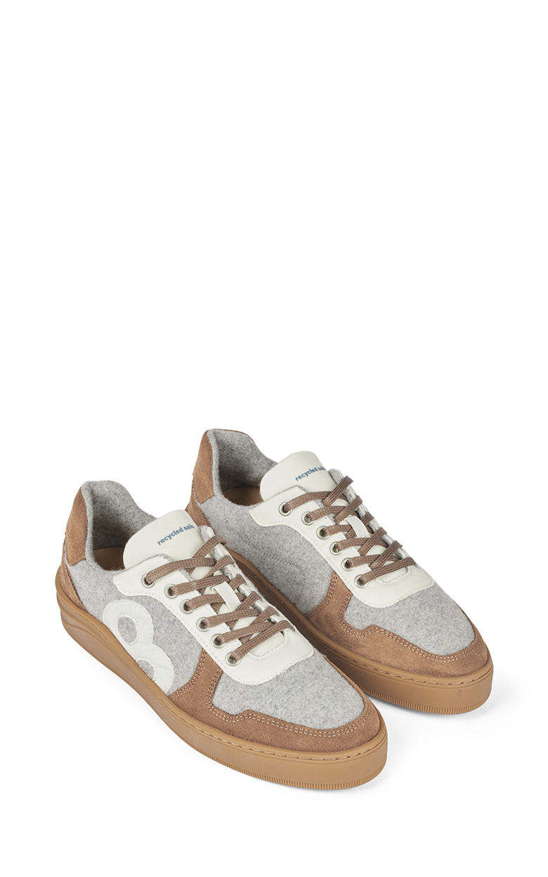 Urban og bæredygtig sneaker med et moderne retro-udtryk. Modellen kombinerer grå filt, sandfarvet ruskind og hvide læderdetaljer for et blødt, naturligt look. Den ikoniske “8”-detalje og den karamelbrune gummisål giver skoen karakter, mens de brunlige snørebånd afrunder designet med varme toner. En sneaker med både stil og omtanke.