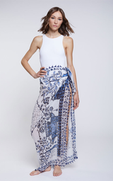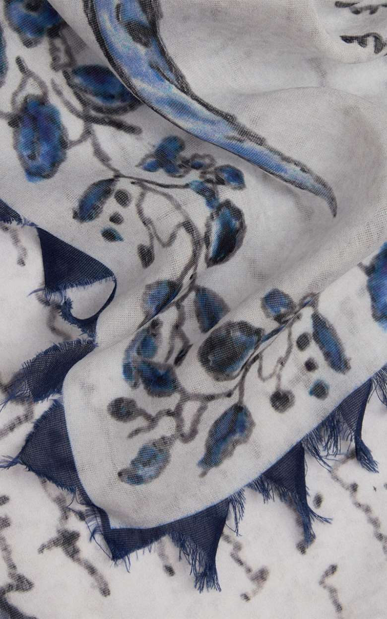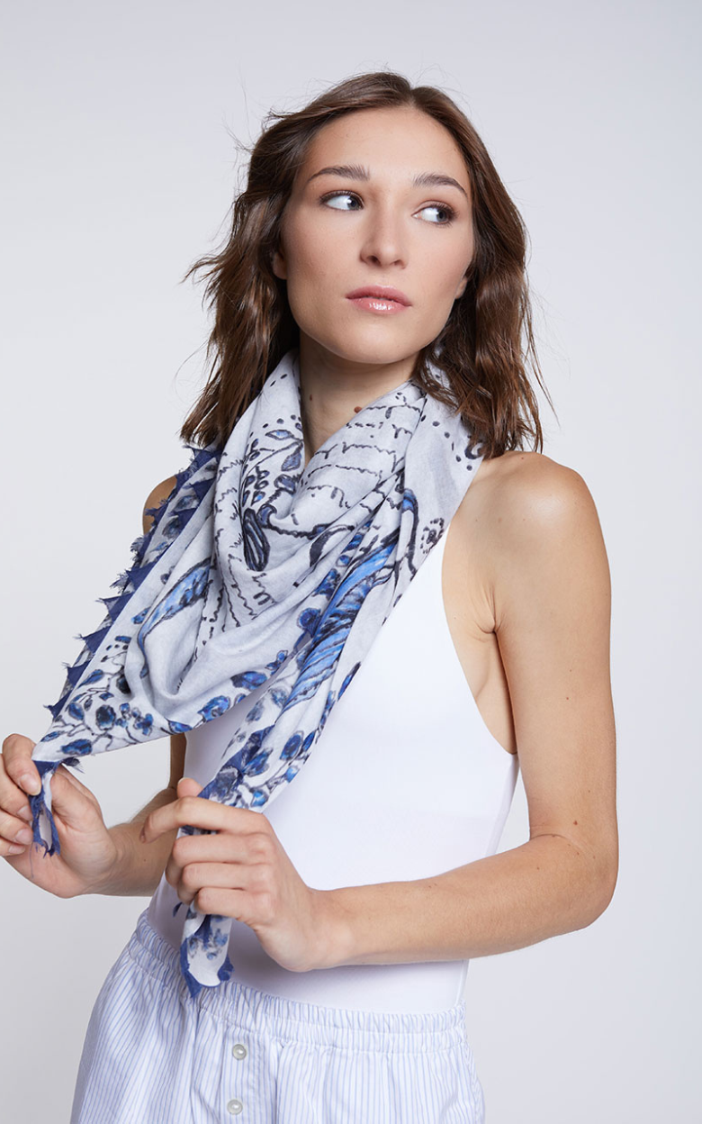 Marcy scarf er et kvadratisk tørklæde fremstillet i en eksklusiv blanding af bomuld og silke. Det blåtonede print tilfører et levende og raffineret udtryk, mens den farverige trekantede kant giver designet karakter og lethed. Et eftertragtet accessory, der er perfekt til at fuldende sommerens looks.