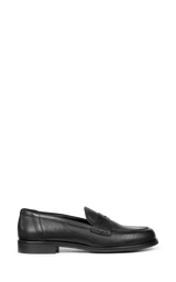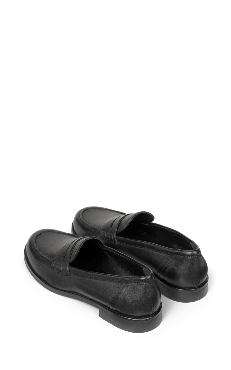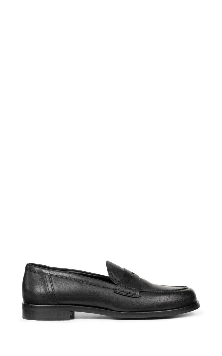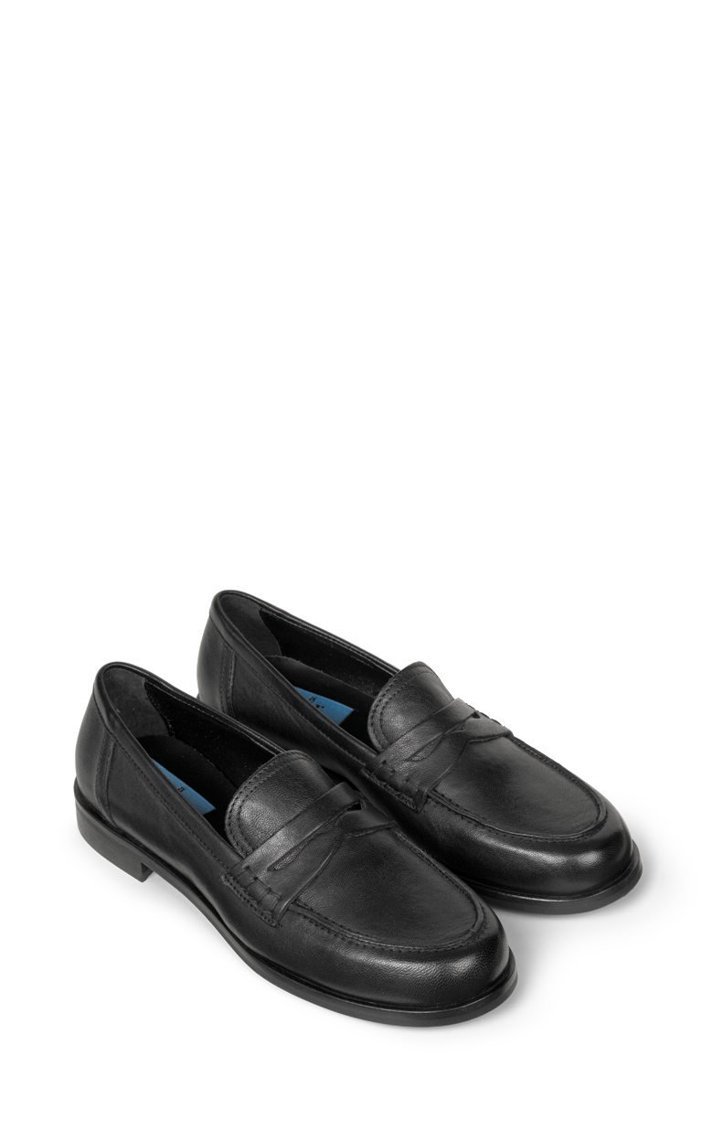 Klassisk penny loafer i glat, sort skind med et elegant og tidløst udtryk. Den enkle silhuet, rene syninger og den lave hæl gør modellen alsidig og perfekt til både arbejde og mere formelle anledninger.