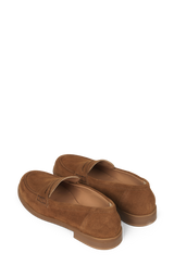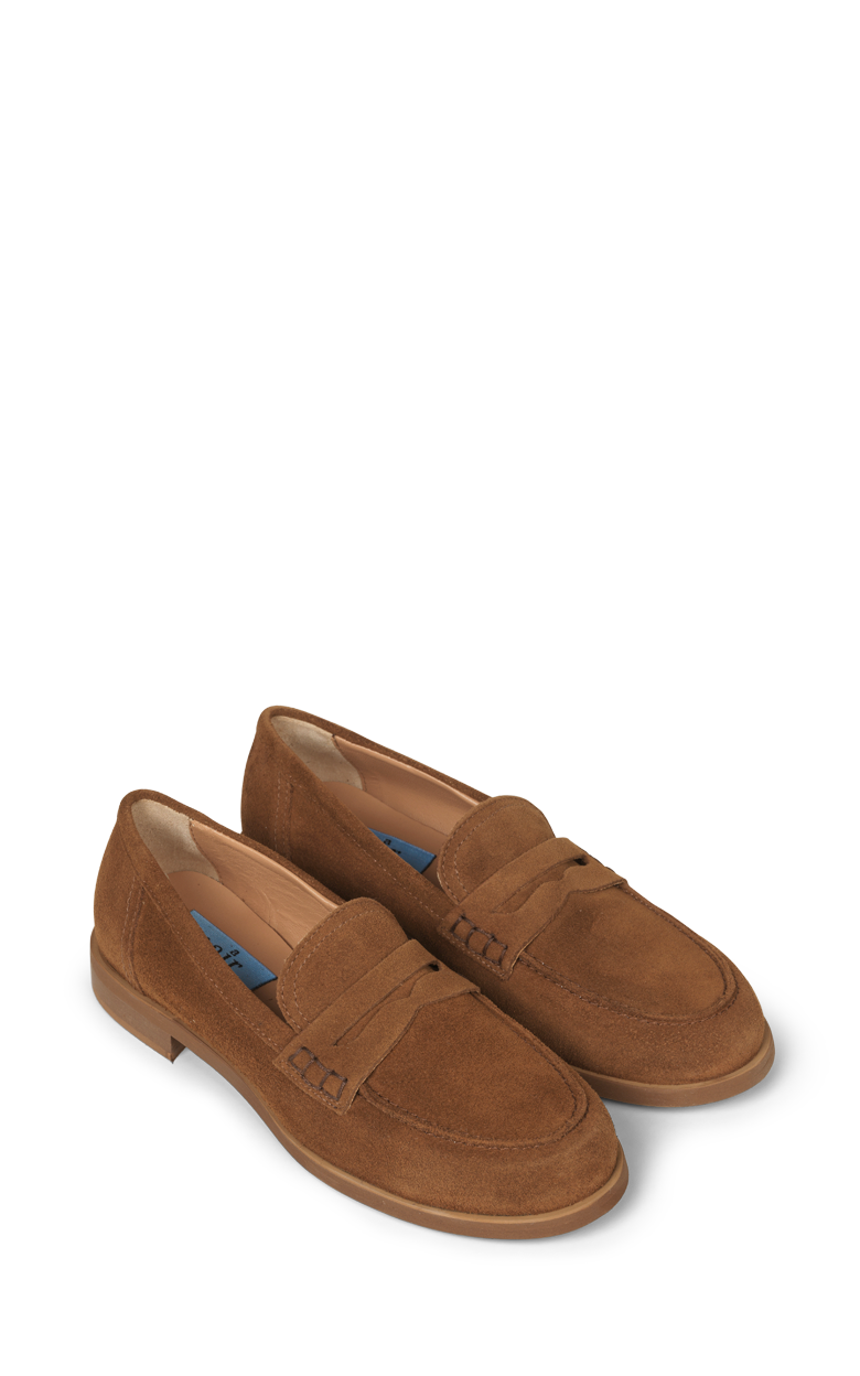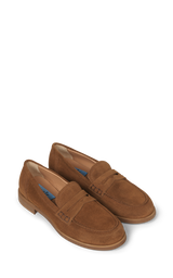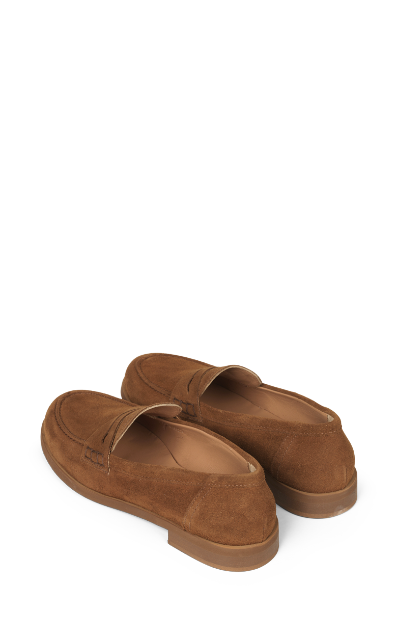 Klassisk penny loafer i blød ruskind – en tidløs sko med et afslappet, men sofistikeret udtryk. Den varme whiskybrune nuance giver et eksklusivt look, der nemt kan styles både til hverdagsbrug og mere formelle anledninger.