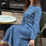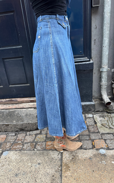 Shaft denimnederdel med høj talje og elegant cirkelskåret snit, der giver et smukt og feminint fald. Nederdelen er designet med to forlommer, hver afsluttet med en ikonisk blomsterknap, som tilfører et karakteristisk og eksklusivt udtryk. Den klassiske denimkvalitet kombineret med det tidløse snit gør nederdelen nem at style både til hverdag og mere sofistikerede looks. Fremstillet i Italien med fokus på kvalitet og håndværk.