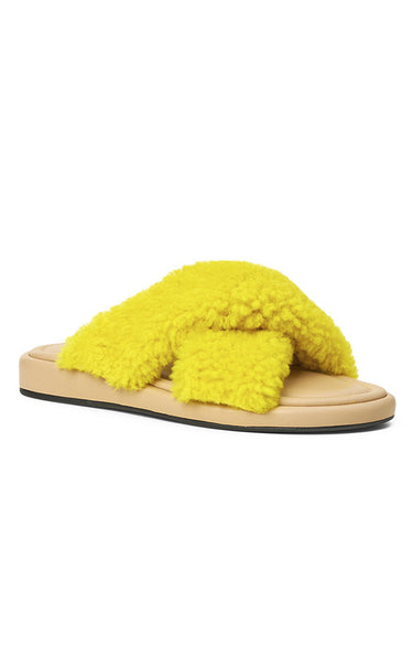 Cool og farverige slip-in's med krydsremme i gul shearling/rulam. Med sine superbløde såler og fluffy remme er det den perfekte behagelige og farverige tilføjelse til din sommergarderobe.