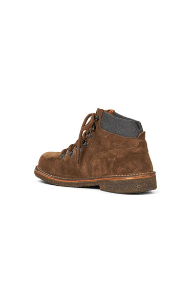 En ny sko med et hiker-look med en gummisål, lavet i en rig brun ruskindsfarve, udstyret med snørebånd foran og med gråt stofmateriale i hælen.