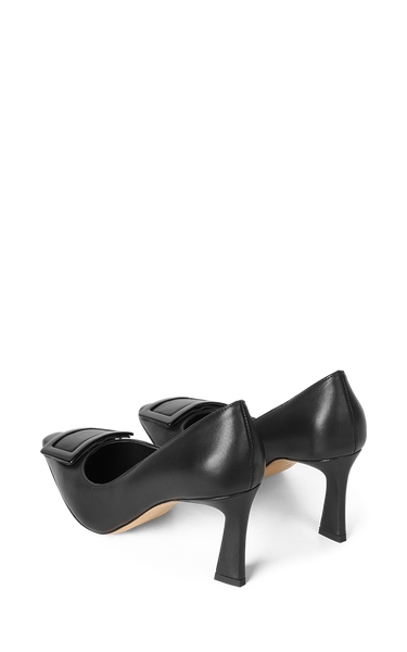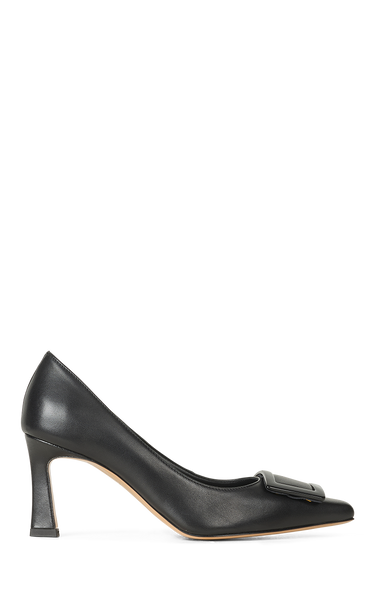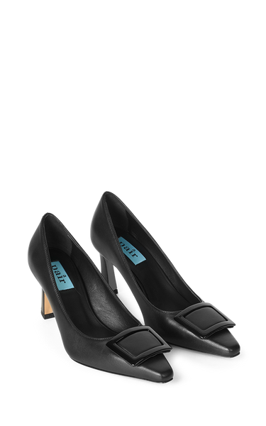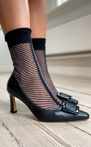 Smukke sorte stiletter med sort spænde på fronten og spids snude. Spændet giver de ellers klassiske stiletter et cool twist.