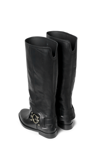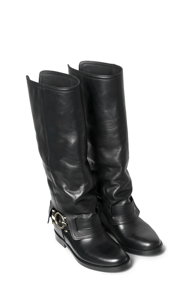 Super cool lange støvler med et ekstra stykke skind udover skaftet og et flot spænde der samler de to stykker skind. Støvlen får en cool "løst" look med det ekstra skind og det guld spænde tilføjer en feminin detalje.