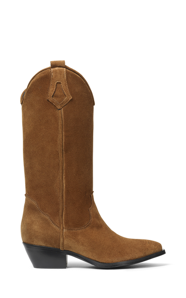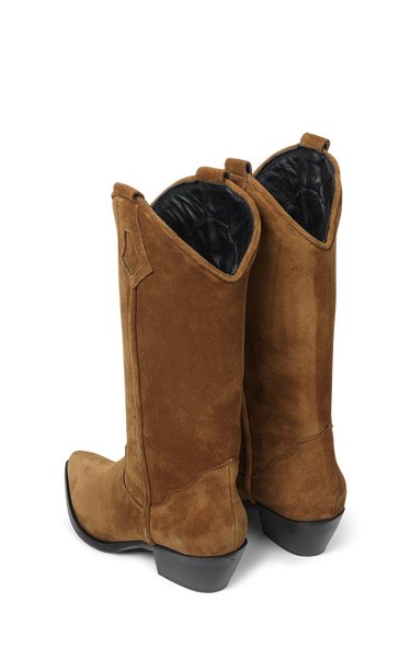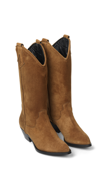Smukke cowboy støvler i cognac ruskind, flotte synings detaljer og en klassisk spids snude.