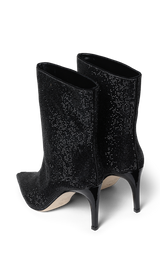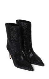 Smukke og cool støvletter beklædt med sorte crystal sten lavet af glas. De har en spids snude, bredt skaft og en 8 cm hæl. Perfekte til vinterens festligheder.