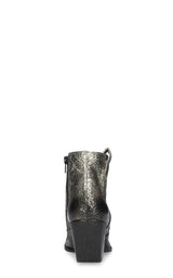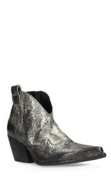 Denne ankelstøvle har en smuk platin overflade på skindet, der giver et cool vintage lignende effekt. Støvlen har lynlås på indersiden af støvlen. Støvlen har læderfor og lædersål. Hælen er 70 mm hæl