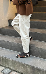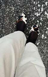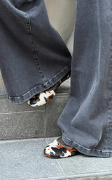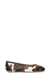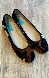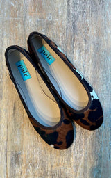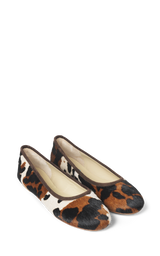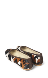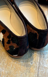 Cool ballerina in pony hair with cow print. They have a brown suede band that runs on the inside and ends the shoe at the heel and suede soles. They are made of soft calfskin, which makes the ballerina super comfortable to wear.