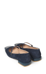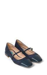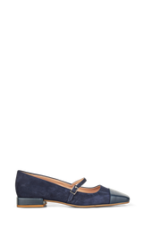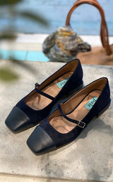 These sophisticated Mary Jane ballerinas combine timeless elegance with a modern silhouette. Crafted in navy suede with a contrasting leather toe, they give an exclusive look. The shoe has a buckle strap adding a feminine touch and ensuring a comfortable fit, while the low block heel provides light height without compromising on comfort. Perfect for both the office and a night out.