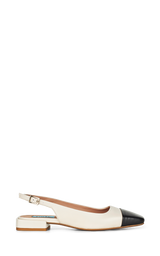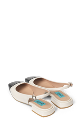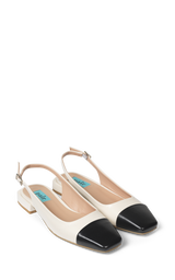 Beautiful shoes in white leather with a black toecap. They have a small square heel and toe - and a slingback with a small buckle.