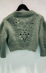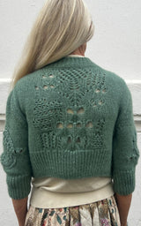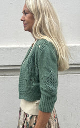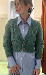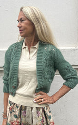 Beautiful dusty green cardigan from Italian Calimar. Large v-neckline mewd ribbed edges. This cardigan has a cropped fit and a button closure.