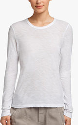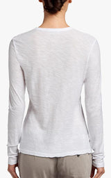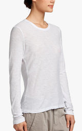 White long sleeve tee with a single pleat, tied neckline. Made from cotton slub fabric (UA) that allows for lightness and comfort. The back of the fabric has been used on the outside of the garment to give extra structure and dimension. Details include full-length sleeves with hemmed cuffs.