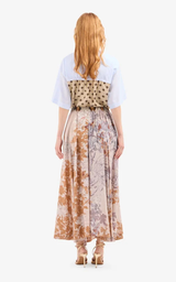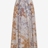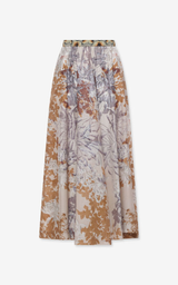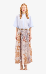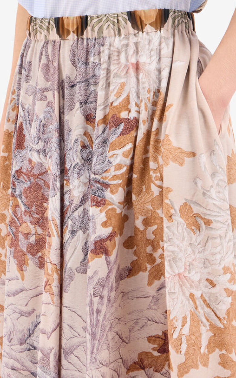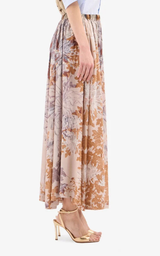 A-line maxi skirt in an elegant design, decorated with a detailed floral print in muted earth tones, creating a romantic and sophisticated look. The light and flowing silhouette provides beautiful movement, while the elastic waist ensures high comfort. A feminine style that can be advantageously styled with a simple silk blouse to let the pattern stand out.
