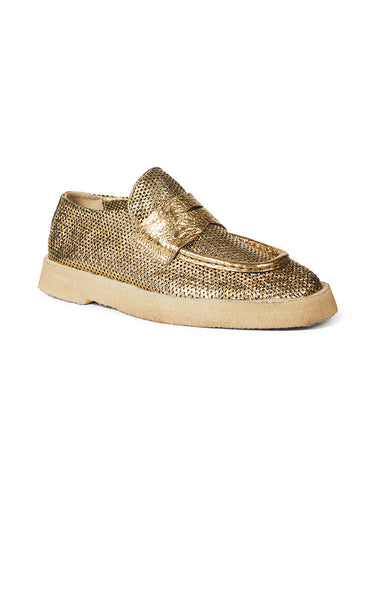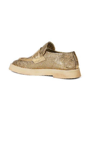 Super cool gold loafers from Rocco. P. Made in the most delicious soft leather and has raw rubber soles. The skin has small "holes" which creates a slightly more summery look.