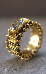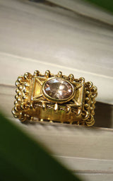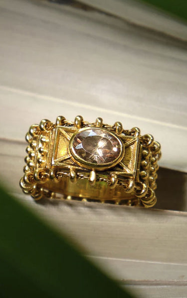 Versatile, wide ring in 24 carat gold-plated 925 Sterling silver with small structured balls and an elliptical, champagne-colored zircon.