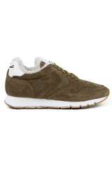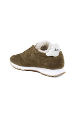 Army green sneakers in suede from Voile Blanche with soft white rye lamb fur inside. These sneakers are perfect if you prefer a sporty look and at the same time want to keep your feet warm. The shoes have army green laces and the logo is presented on the front and back of the heel.