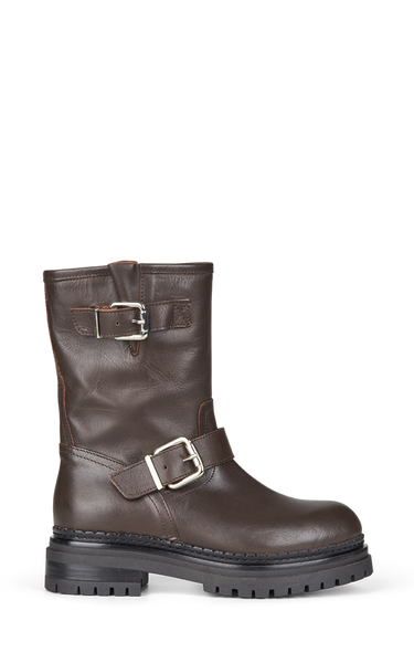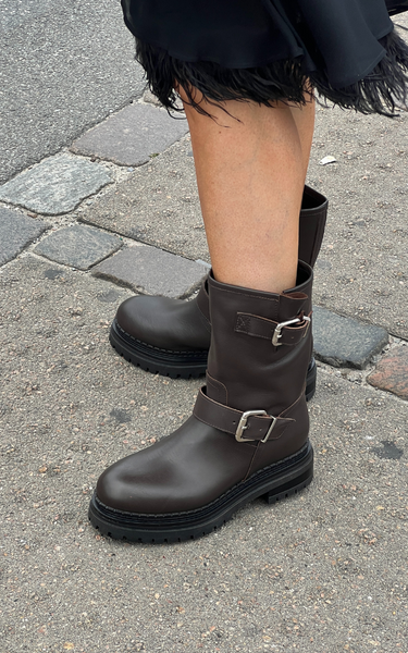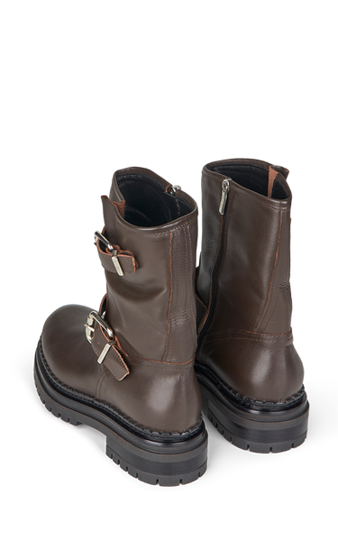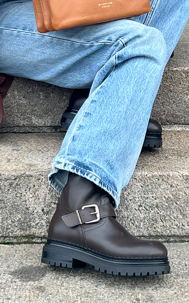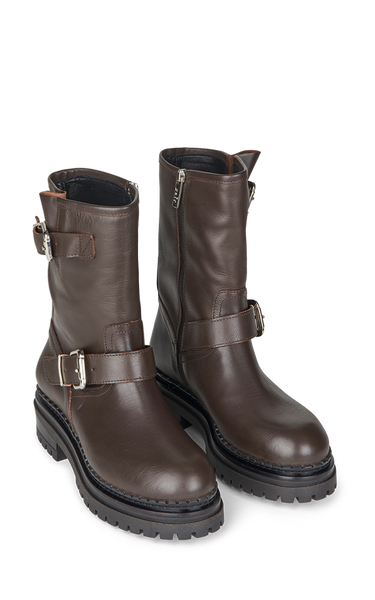 Our cool classic biker boots are back - now in brown smooth leather and with silver buckles. They have a zipper on the inside and two buckles on the outside, medi chunky rubber soles and a shaft length of approx. 22 cm.