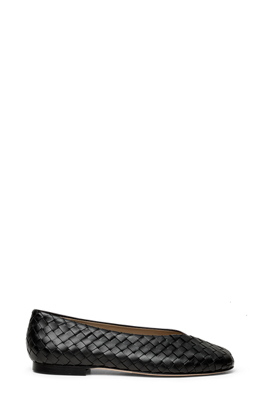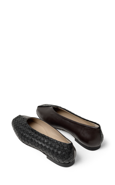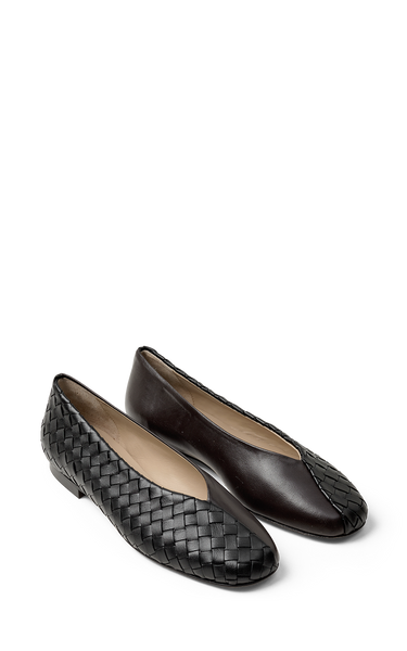 The most beautiful flat shoes made with an asymmetrical look, in black braided leather on one side and brown smooth leather on the other. They have a nice square toe and leather outsoles and soles.