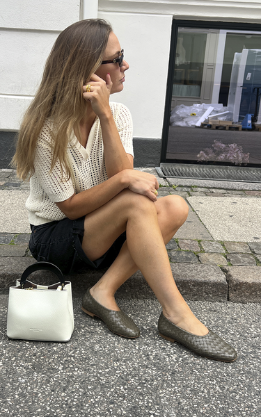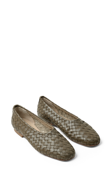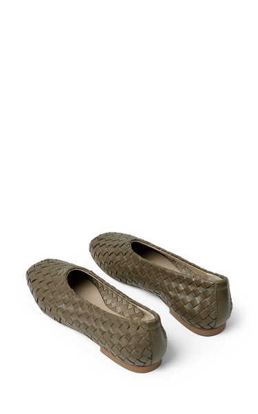 The most beautiful flat shoes made of military green braided leather - which makes the shoes super soft and comfortable to wear. They have a rounded square toe and leather outer and inner soles.