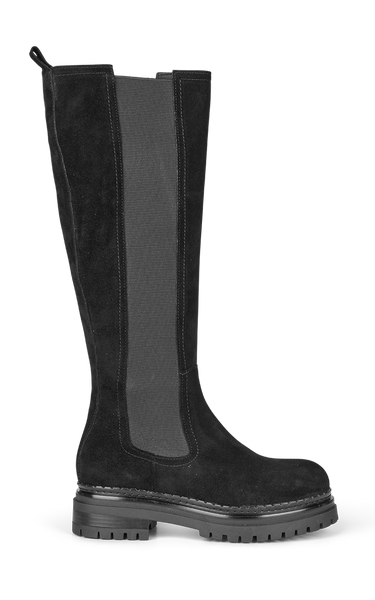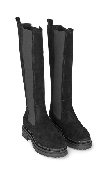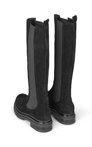 Cool long boots in black suede with elastic on both sides - which makes the shaft more flexible. They have a round toe and medi chunky rubber soles and a shaft length of approx. 41.5 cm.