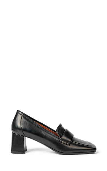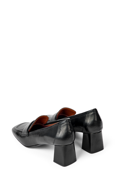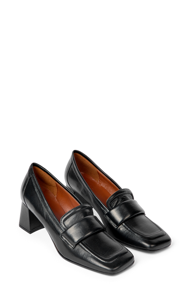 Beautiful high loafers made of black leather. They have a square toe and a wide and soft belt over the foot. They are super comfortable and have room for a slightly wider foot.