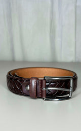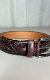 Beautiful classic belt in brown smooth leather with braided front and oxidized buckle.