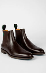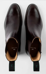 Nice classic chelsea boots in dark chocolate brown leather. They have tone-ii-tone elastic on the sides and rubber soles.