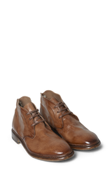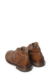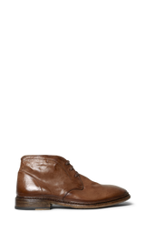 Nice boots in brown leather with three lace holes. The boots have a short shaft which gives them a light appearance and have leather soles covered with rubber forefoot and heel.
