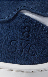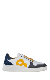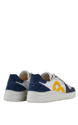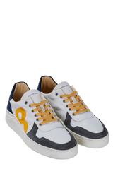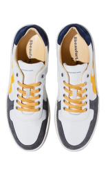 White sneakers with dark blue and yellow details from 8beaufort.Hamburg, made of recycled canvas, with suede details, upcycled life jackets and a super soft natural rubber sole. The lining is made of genuine chrome-free vegetable tanned leather.