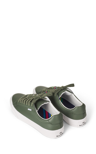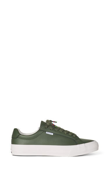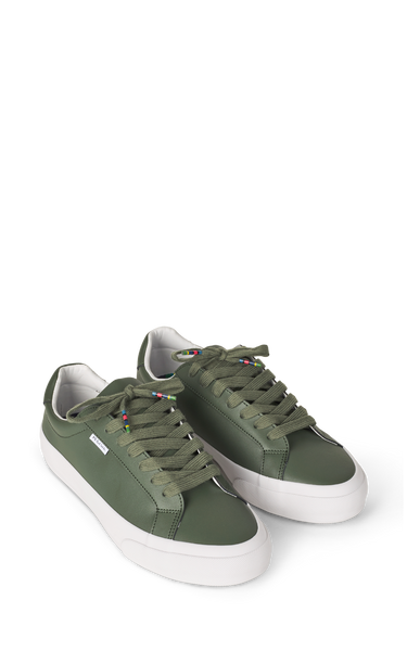 Great sneakers in beautiful dark green smooth leather with wide white rubber soles. They also have green laces that have a fun colorful ending.