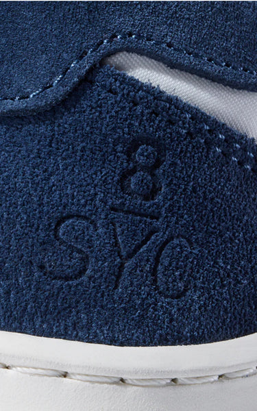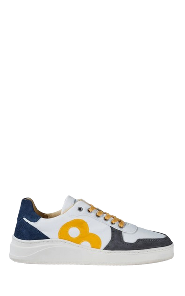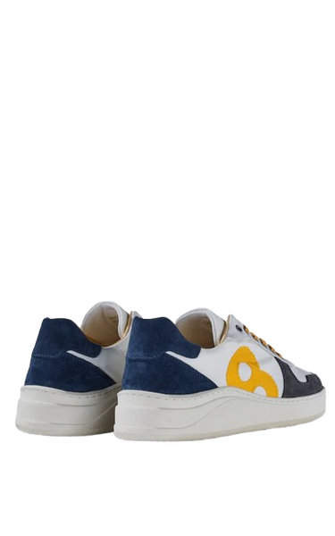 White sneakers with dark blue and yellow details from 8beaufort.Hamburg, made of recycled canvas, with suede details, upcycled life jackets and a super soft natural rubber sole. The lining is made of genuine chrome-free vegetable tanned leather.