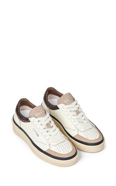 Cool sneakers from Ghoud - made of eggshell colored smooth leather, with sand colored suede details, fluffy laces and with brown glitter around the opening. They have rubber soles in an off-white color.