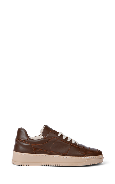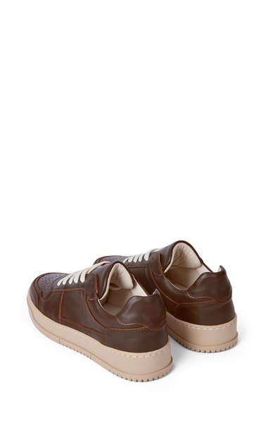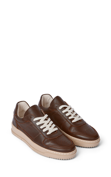 Sneakers in dark brown leather with a light beige rubber sole. They have white laces and a 3 cm. sole.