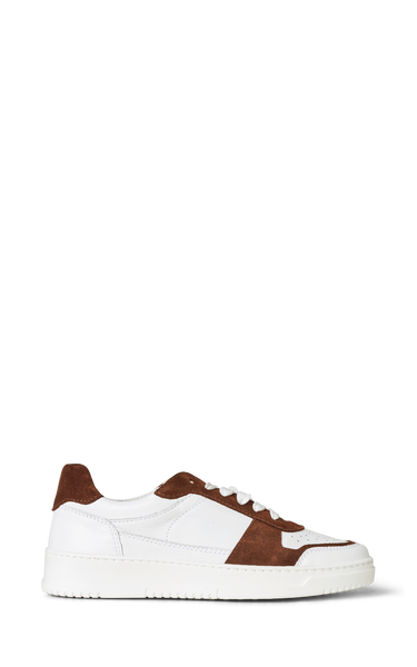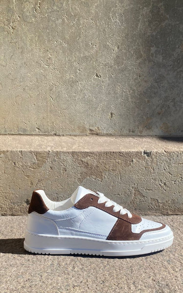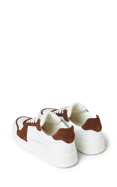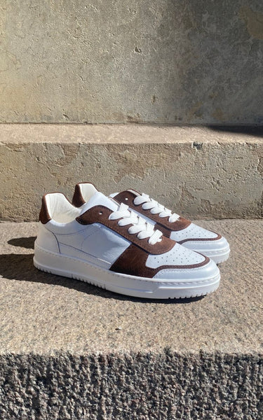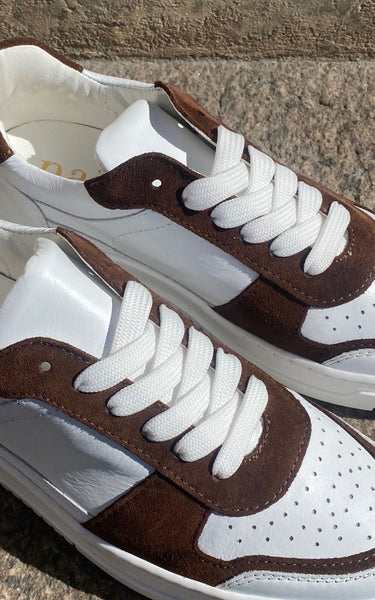 Cool sneakers in a combination of dark brown suede and white calfskin. White laces, white rubber soles and soft leather insoles.